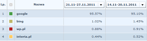 Google to aktualnie bezapelacyjny lider wśród wyszukiwarek. Drugie miejsce z niecałym 2% udziałem w rynku zajmuje bing.com. Reszta wyszukiwarek w Polsce, np. interia oraz onet korzystają z silnika google, co oznacza iż wyświetlają takie same wyniki jak lider.